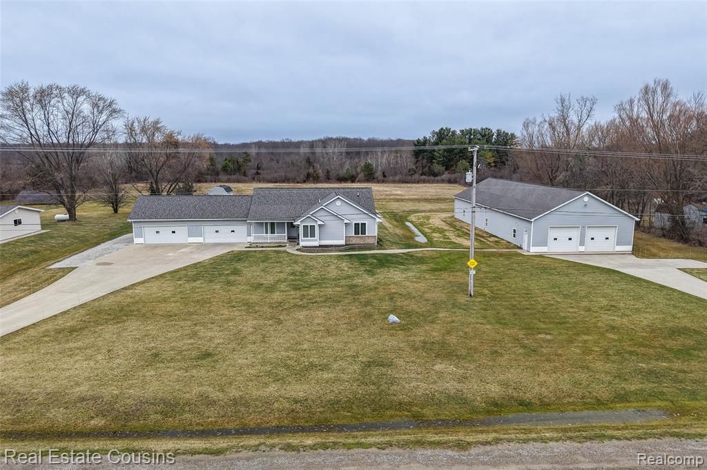 Welcome to an outdoorsman’s dream property nestled in the peaceful countryside of Gaines! With a total of 4.97 serene acres, this beautiful ranch home offers the perfect combination of comfort, privacy, and space for all your hobbies. Inside, you’ll find 3 bedrooms and 2 full bathrooms, highlighted by cathedral ceilings in the living room and kitchen that create a bright, open feel. The large dining area off the kitchen offers plenty of room for entertaining with family or friends. The primary suite features its own private bath and a spacious walk-in closet, offering a relaxing retreat at the end of the day and a full unfinished basement. Car enthusiasts and hobbyists will love the attached 4-car garage, plus an incredible 40x100 detached outbuilding designed with functionality in mind. This impressive structure features 13+ ft walls, heat, and floor drainage for washing vehicles indoors, making it perfect for working on cars, storing equipment, or creating the ultimate workshop. A staircase leads to additional overhead storage, ideal for keeping extra parts and gear neatly out of the way. Step outside and unwind on the front porch or back deck, where you can take in the peaceful surroundings and enjoy the abundance of wildlife that calls this property home. If you’ve been searching for a property that offers privacy, space, and the ultimate setup for outdoor living and hobbies, this slice of paradise is ready to welcome you home.